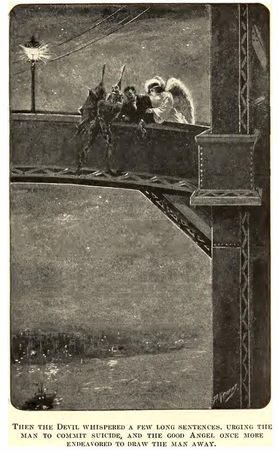 Then did the Devil whisper a few long sentences so low that no one could hear but the listener. It was a terrible temptation playing upon the man in his weakness. It was his purpose to heed the voice of the good angel, but he somehow felt that he was being drawn away from the light that was trying to enter his soul, and so, in the desperation that was born of this thought, he seized his enemy as if in bodily conflict, and taking advantage of the advice previously given to him by the angel, he called upon God for help. After a sharp decisive struggle Satan was pushed off of the bridge, but it seemed as if he did not fall into the water. The man quickly turned for he felt a saving hand upon him, and to his happiness he found that the angel had not let go of him during all the conflict. Never did any creature seem so beautiful as the angel appeared to him at that moment. He had conquered in the conflict, and next he breathed out his petition on the midnight air that God might help him through the troubles that had almost overwhelmed him. His prayer was answered and over the wrecks of a wasted life he reared a building of character and wealth that he humbly dedicated to the unseen God.