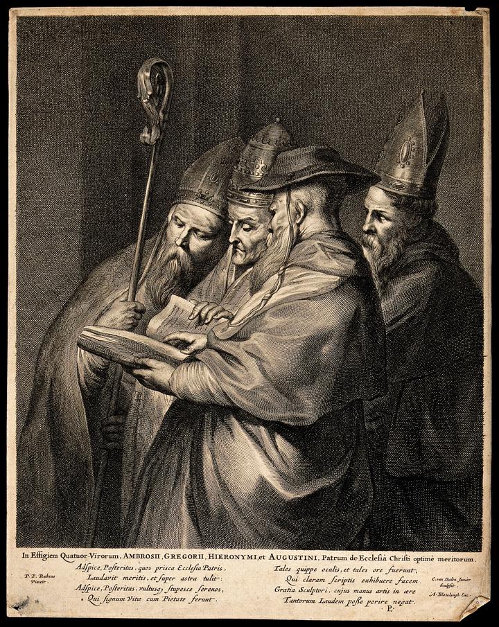 Image: “Saint Ambrose, Saint Gregory the Great, Saint Jerome and Saint Augustine of Hippo. Engraving by C. van Dalen after Sir P.P. Rubens.” from wikimedia commons.